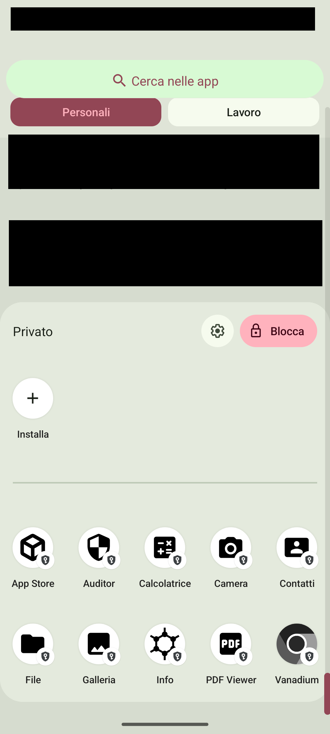 Lo spazio privato si trova in fondo al menu applicazioni e si apre cliccando sul lucchetto. Le app dello spazio privato hanno uno scudo con la chiave come simbolo, mentre quelle del profilo di lavoro hanno l'icona della valigia. In questo spazio privato non ci sono app personali installate, ci sono solo quelle predefinite di GrapheneOS, su altri sistemi ce ne sono di meno. (Le bande nere sono app oscurate, se te lo stessi chiedendo)