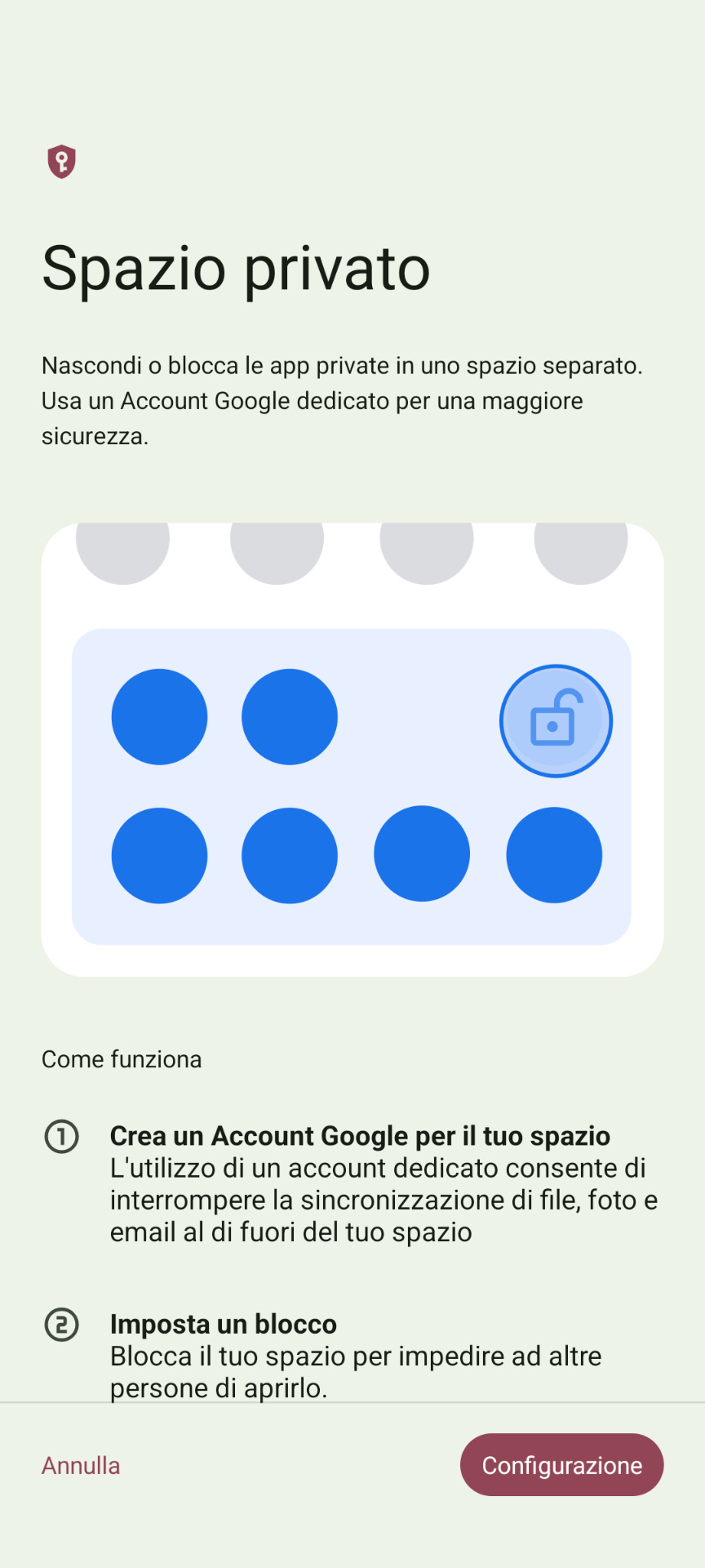 Lo spazio privato - soluzione preferibile al profilo di lavoro ma disponibile solo per smartphone con Android 15 o superiore.
