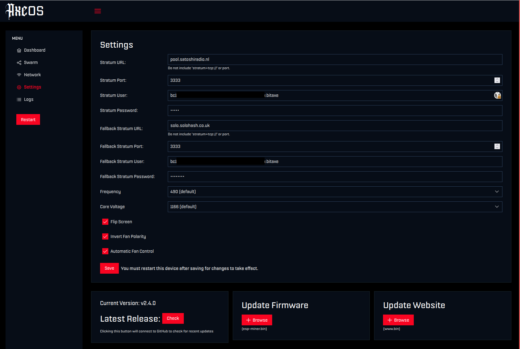 bc1tuoindirizzobitcoin.bitaxedove alla fine dell'indirizzo, separato da un punto, c'è il nome del dispositivo (anche qui puoi inventarlo e non è obbligatorio).È fatta! Premi su Save e fai nuovamente Restart: da questo momento il tuo Bitaxe sta già minando bitcoin in modalità solitaria e stai già contribuendo alla decentralizzazione del mining 🎉
