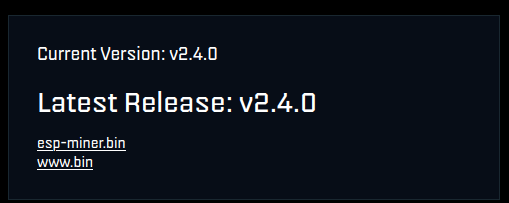 Se individui che esiste una versione più recente di quella che hai sul Bitaxe, ti consiglio di aggiornare: ti basta scaricare i due file. Lo puoi fare cliccando i due link sotto la scritta Latest Release dentro Settings, oppure dalla pagina GitHub, cercando i file chiamati esp-miner.bin e www.bin