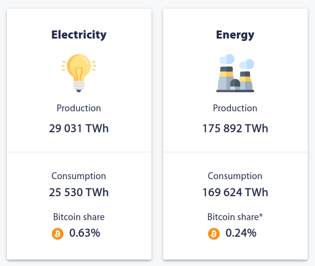 Una stima del consumo totale del mining comparato con la produzione e il consumo mondiale è questa:
