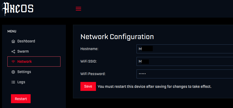 Vai nella sezione Network. Inventa un hostname (il nome sulla rete locale del tuo Bitaxe) e fornisci le credenziali alla rete WiFi a cui vuoi farlo connettere. Mi raccomando rete WiFi a 2.4GHz, la 5GHz non è supportata! Tra i campi da compilare vedrai l'SSID: è il nome della tua rete WiFi di casa, mentre la password è la solita password del tuo WiFi (che spero tu abbia cambiato da quella predefinita!). Premi Save e poi su Restart in rosso.