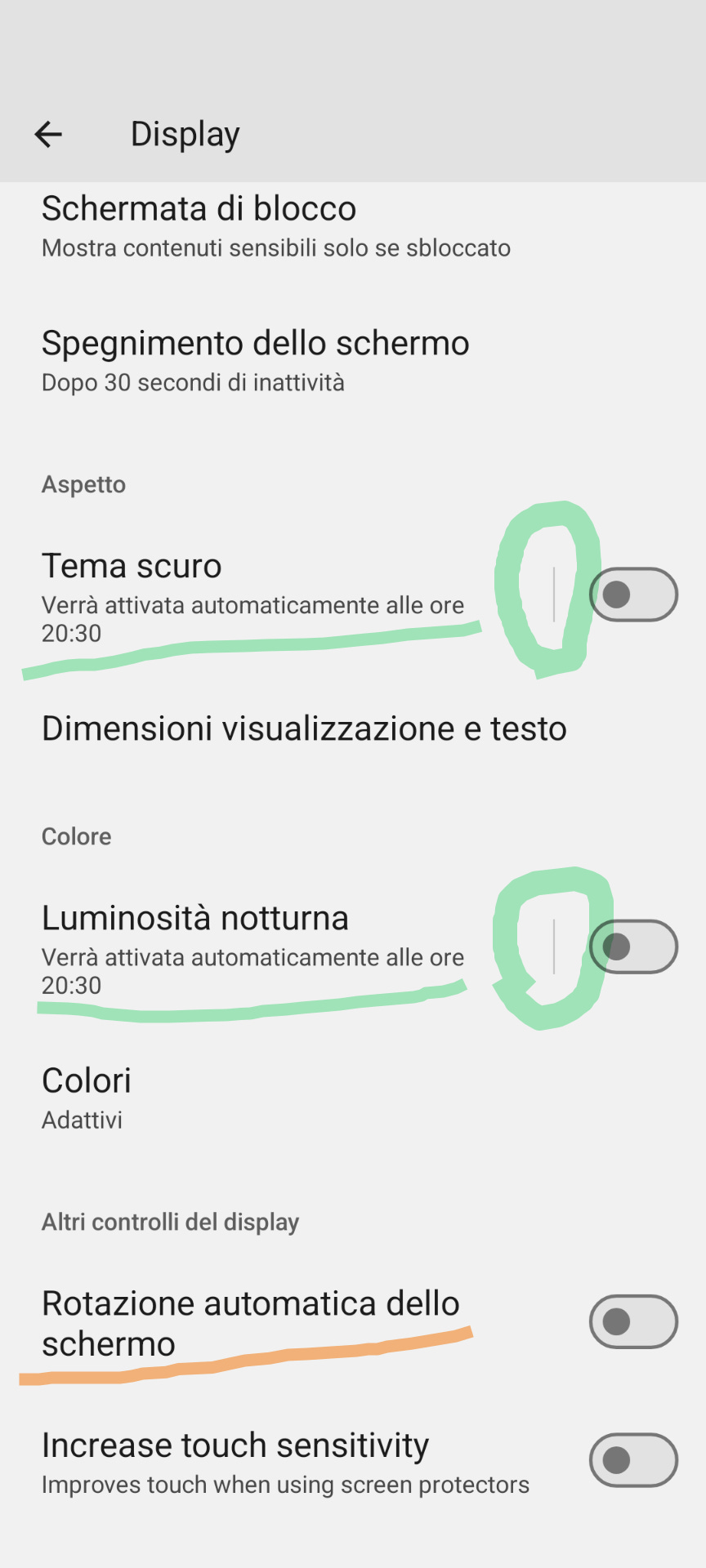Esempio: se tocco l'opzione arancione mi si attiva. Se tocco l'opzione in verde mi entra nelle sue impostazioni specifiche, perché c'è la | grigia invisibile!