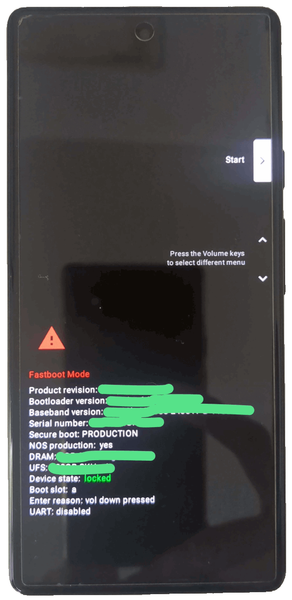 Perfetto! Non mi rimane che l'ultimo bottone da utilizzare. Devo infatti bloccare il bootloader, premo quindi su Lock bootloader. Anche qui devo confermare con i tasti volume e il tasto di accensione. Il Pixel si riavvia nuovamente e mi ritrovo sulla solita schermata del bootloader dove è indicato Start: quindi premo nuovamente il tasto di accensione, e si parte!