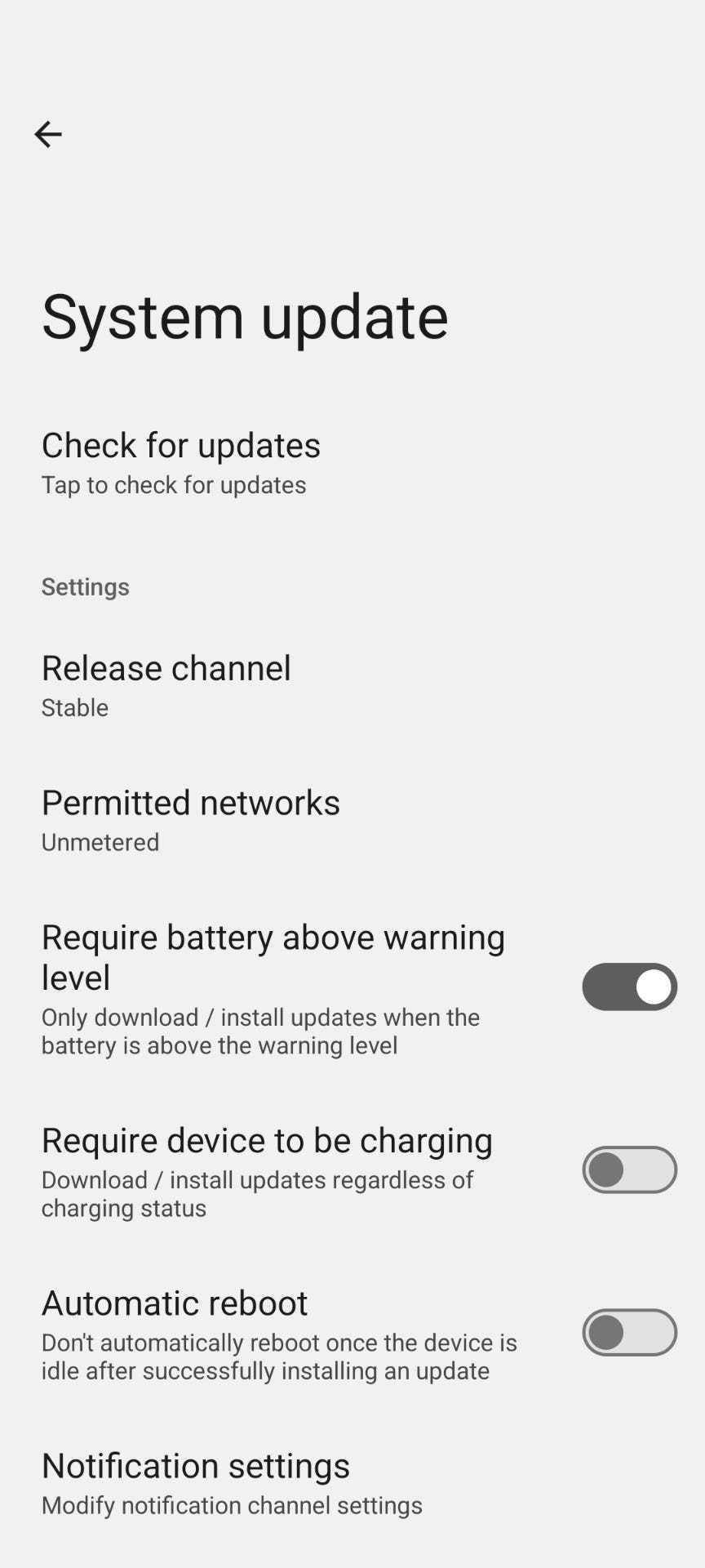 A sinistra hai le impostazioni di aggiornamento del sistema operativo. A destra, le impostazioni di aggiornamento delle app contenute in App Store, l'app che contiene Vanadium, Play Services, ecc.