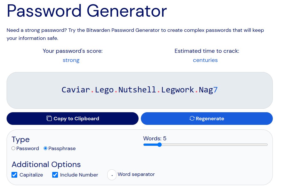 Puoi anche farti aiutare da generatori automatici, anche perché non è che passi la giornata a inventarti scenette esilaranti no? Questa pagina di Bitwarden ci genera una passphrase in inglese, così: