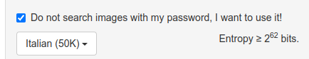 e di selezionare la lingua nel menu a tendina bianco. Purtroppo non ci sono i dialetti italiani, ma se ti inventi una passphrase in dialetto sei a cavallo 🐴! Questo sito ogni tanto pesca parole un po’ dubbie, ma è anche più divertente delle volte, prova a generarne un po’!